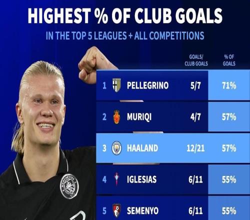 德国转会市场网站列出了本赛季五大联赛球员进球占球队总进球比例排行榜,打入12球的哈兰德以57%排名第三。本...